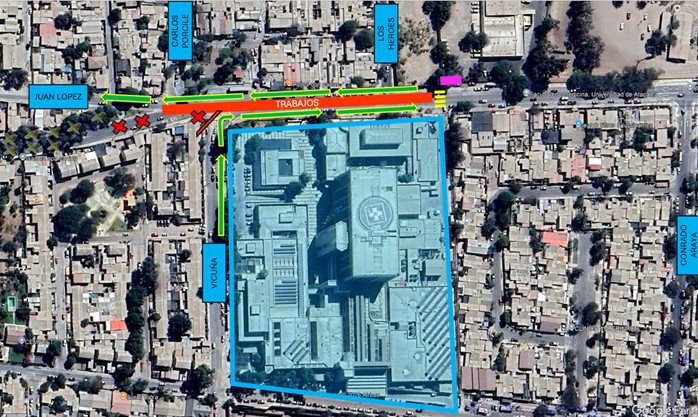 • Rutas alternativas sugeridas: Para quienes se desplazan por calle Vicuña y deban dirigirse hacia el centro: Tomar calle O?Higgins hacia el oriente, luego Conrado Araya hacia el norte y, finalmente, girar para retomar Avenida Los Carrera en dirección al centro.